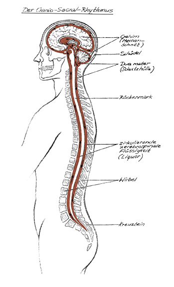 Die Gehirn- und Rückenmarkflüssigkeit (Liquor), wird aus arteriellem Blut rhythmisch gebildet und fliesst in dem Membransystem der Hirnhäute zwischen Schädel (cranium) und Kreuzbein (sacrum). Sie schützt und nährt das Gehirn und Rückenmark sowie das zentrale Nervensystem. Die Schädelknochen passen sich dem wechselnden Flüssigkeitsdruck durch sehr feine Bewegungen an. Dieser langsame unwillkürliche Rhythmus überträgt sich wahrnehmbar auf den gesamten Körper und ist ausschlaggebend für die Entwicklung und Funktionsfähigkeit des ganzen Menschen. Stellt sich ein Ungleichgewicht oder eine Beeinträchtigung des craniosacralen Systems ein, können eine Reihe sensorischer, motorischer, neurologischer oder emotionaler Störungen entstehen, die sich durch vielfältige Symptome im Körper ausdrücken. Die Absicht der Craniosacralen Therapie ist das Gleichgewicht dieses Systems durch feine manuelle Impulse wiederherzustellen, die körpereigenen Heilkräfte zu aktivieren und die Resourcen zu stärken, sodass positive Veränderungen stattfinden können.